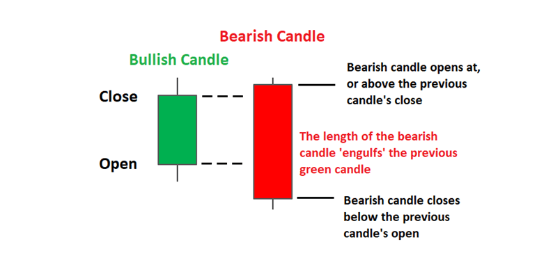 A bearish engulfing pattern develops in an uptrend when sellers outnumber buyers. This action is reflected by a long red real body engulfing a small green real body. The pattern indicates that sellers are back in control and that the price could continue to decline.