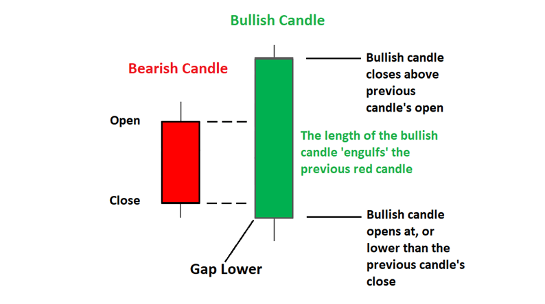 An engulfing pattern on the bullish side of the market takes place when buyers outpace sellers. This is reflected in the chart by a long green real body engulfing a small red real body. With bulls having established some control, the price could head higher.