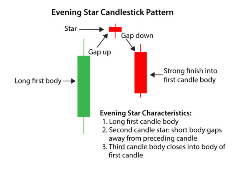 An evening star is a topping pattern. It is identified by the last candle in the pattern opening below the previous day's small real body. The small real body can be either red or green. The last candle closes deep into the real body of the candle two days prior. The pattern shows a stalling of the buyers and then the sellers taking control. More selling could develop.