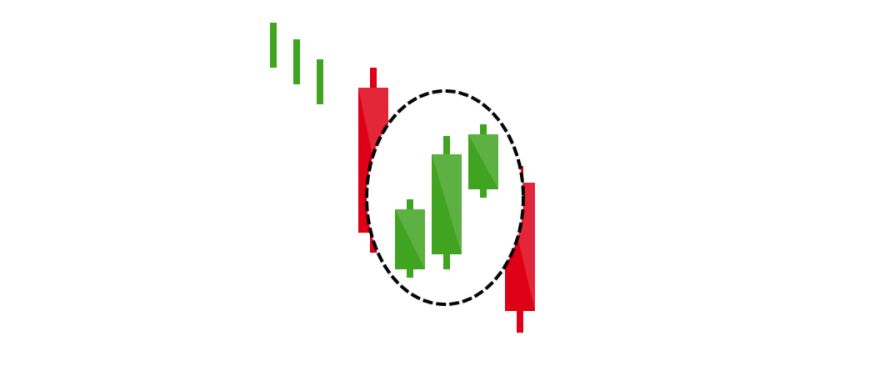 The pattern starts out with a strong down day. This is followed by three small real bodies that make upward progress but stay within the range of the first big down day. The pattern completes when the fifth day makes another large downward move. It shows that sellers are back in control and that the price could head lower.